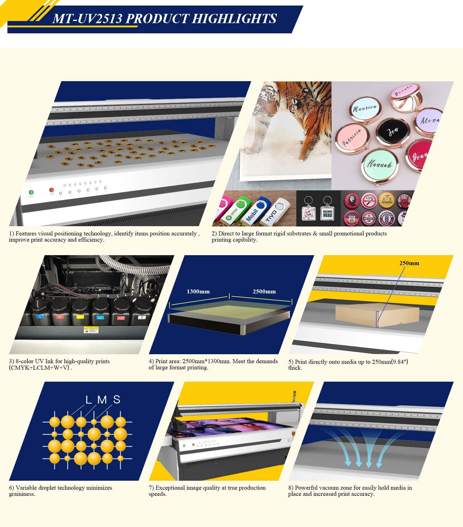 Our new flagship product MT - UV 2513, a reliable, flexible and high-volume UV flatbed printer that has been purpose-built for producing exceptional print quality and the highest productivity for a wide range of rigid media and promotional items applications. It delivers precise detail, bright and colorful prints with low graininess and smooth gradation.
